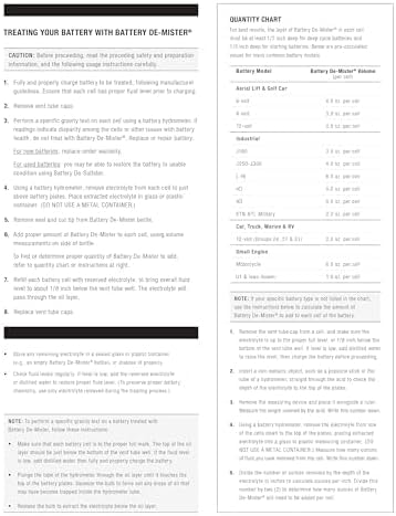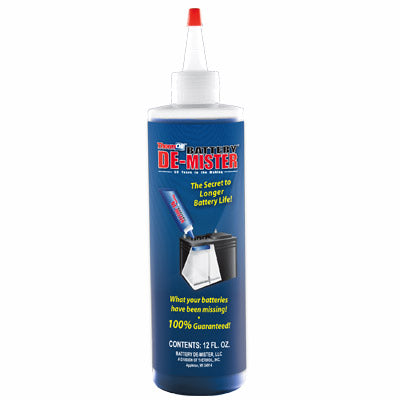 Battery De-Mister® with ThermOil® technology is a patented battery oil made of a combination of severely hydro-treated naphthenic base oils and hydrogenated polyalphaolefin synthetic oil coupled with an effective ash-less non-acidic rust inhibitor. Incorporated in the oil are an amine type anti-oxidant and an olefi n co-polymer type viscosity modifier. This unique base oil mix serves to eliminate polar sites, thus the oil has no inclination to attach itself to the plates of the battery thereby preventing the battery from premature failure during deep discharge cycles. Battery De-Mister has an indefinite shelf life.
