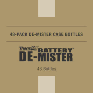 The 48-Pack De-Mister 12 oz bottle Case contains forty-eight (48) bottles of ThermOil® Battery De-Mister®.
